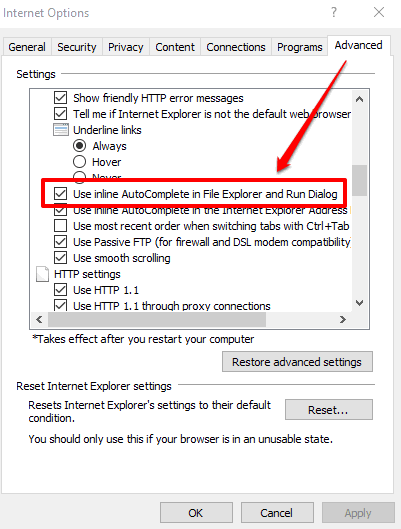 Step 4: Advanced tab contains a lot of options. Scroll down the list and access “Use inline AutoComplete in File Explorer and Run Dialog” option. By default, this option is not selected. You need to select it, press Apply, and then OK button.
