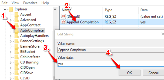 Step 2: Explorer key contains an AutoComplete sub-key. Under that key, there is an Append Completion String value. The value data of that Append Completion value is set to ‘no’. You need to change this Value data from no to ‘yes’.