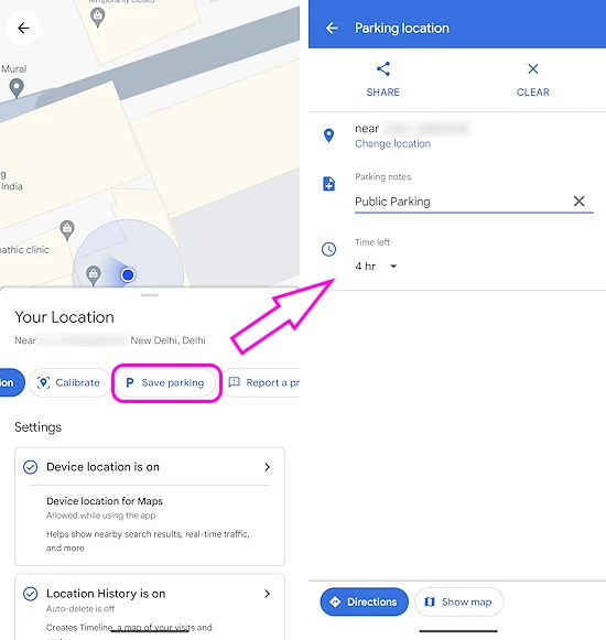 To use this feature simply open the Google Maps on your phone and tap on the blue dot that shows your current location on the map. When you do that, it brings up a “Your Location” card on the screen. Tap on that card with all the info and options. There you get a “Save parking” feature. Tap on that button to save the parking location. You can also add parking notes and parking time to the saved location.