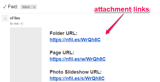 Step 3: Another interesting feature of nFil.es is that if the email contains attachments, then it will create multiple links including a folder link for attachments, email body link, and a photo slideshow link (if the attachment includes photos).