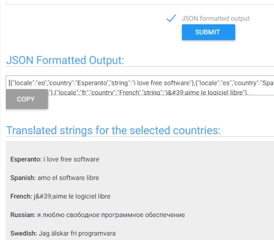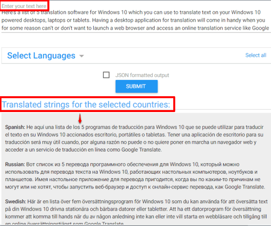 Step 3: This is the last step to generate the output. Before translating the text, you can also enable option to generate JSON formatted output. That’s it! Press SUBMIT button and it will generate output shortly.