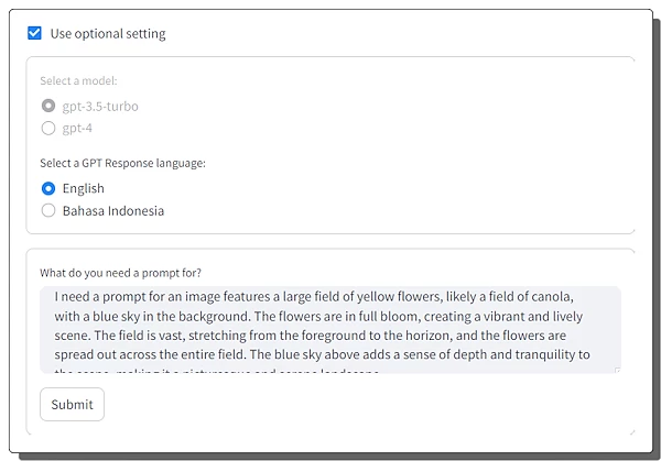 The “Playground” also has optional settings with model and response language selection. The model selection no longer works means the generated prompts can be used with any AI tool. However, there are two response languages available; English and Bahasa Indonesia.