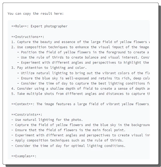 When you submit the input, it takes a few seconds to generate the output. The tool provides a prompt in RICCE format covering Role, Instructions, Context, Constraints, and Examples. It also offers Suggestions that provide more detail and can help you improve your previous prompt. You can run the edit the generated prompts and run it again till you are satisfied with the result.