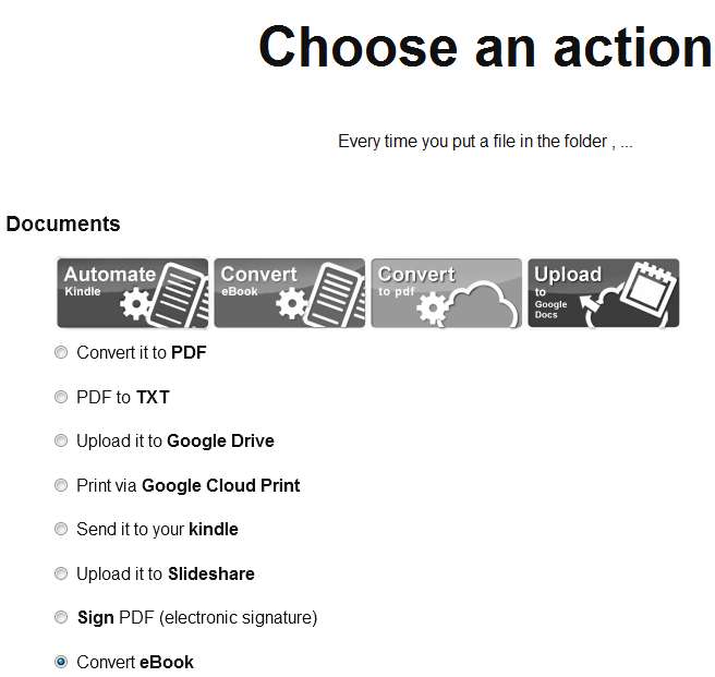 When it comes to Dropbox, you can allow access to one folder, or the entire account. Once that you logged in, you can start setting up automation that you would like applied to files which are saved in the selected folder. In the image above we’ve selected to convert an eBook.