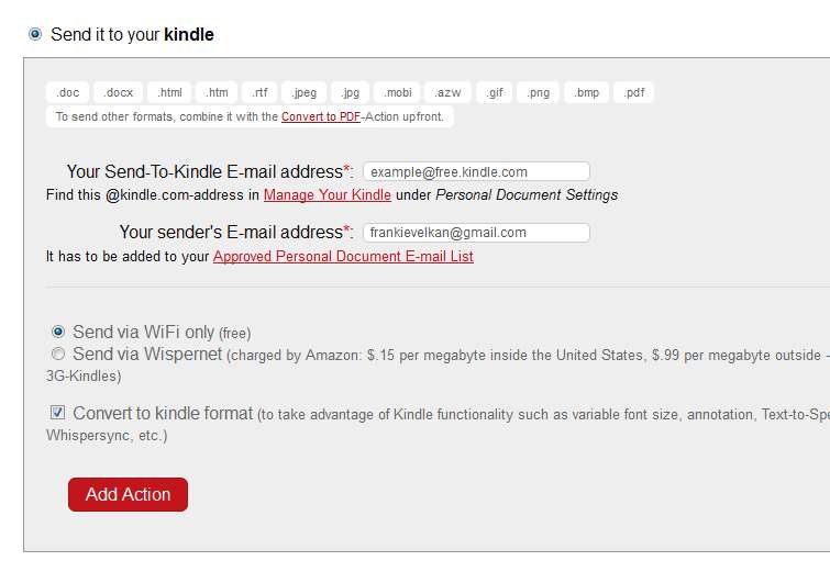 Send to Kindle option is also available which is also bundled with a format conversion. Go over all the settings, enter your send to kindle email and click Add Action button. Do the same for every other automation that you would like to see and it will be saved. The next time that something’s saved to the selected folder of the online file storage service that you’ve setup, saved action will be carried out.