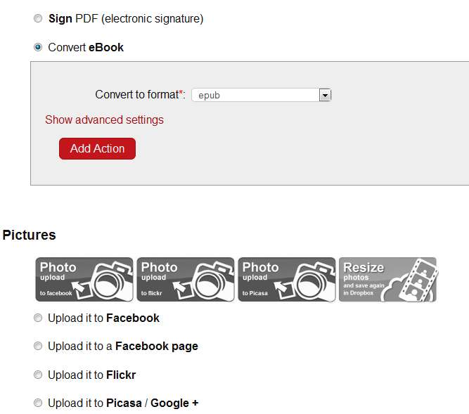 In the screenshot above you can see just some of the services that are available to you, with the help of which files can be manipulated automatically. Most interesting feature, out of the ones that are offered above, would be conversion from PDF or to PDF and also upload to other file hosting services like Google Drive.
