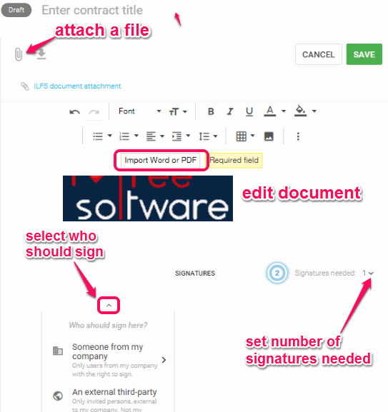 Step 3: You can edit the uploaded document and save the changes. You can also set multiple options for that document, like the number of signatures needed for the contract, who should sign the contract (you, all or a particular contractor).