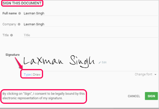 Step 5: Contractor will receive emails and they can sign up to this website to access your contract. They can read the document, discuss with you related to the document, check version history, and more. If everything is good, they can sign the contract using SIGN button. To sign the document, they can select any of the available fonts and draw their digital signature.