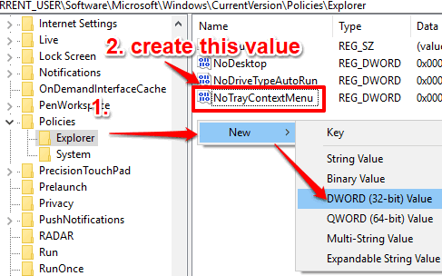 Step 3: Explorer key has a NoTrayContextMenu DWORD value. If this DWORD value is not present, then you can manually create it. Right-click the empty area available on the right-side, New, and click the DWORD (32-bit) option. This will create a DWORD value. After that, set its name as “NoTrayContextMenu“.