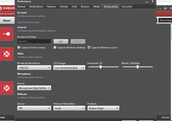 Screen broadcasting can only be done to Twitch. It’s the only supported streaming service. For broadcasting to work, you’ll need to connect your Twitch account with the Evolve application (go to Settings >> Broadcasting). Available settings include things like setting the resolution, CPU usage priority, frame rate, bitrate, input devices (camera, microphone, etc.) and more. Streaming can be assigned to and activated with keyboard hotkeys. Copy of the broadcast can be saved locally to a file. MOV and MKV file formats are supported. Once that Twitch and Evolve are connected, you’ll be able to keep track of broadcasts from people you’re friends with from within Evolve. Just look up streams posted by friends in the “Broadcasts” tab. Before using any of the functionalities available in Evolve you’ll need to register and confirm your account. Account registration is mandatory before you’ll be able to use the application.