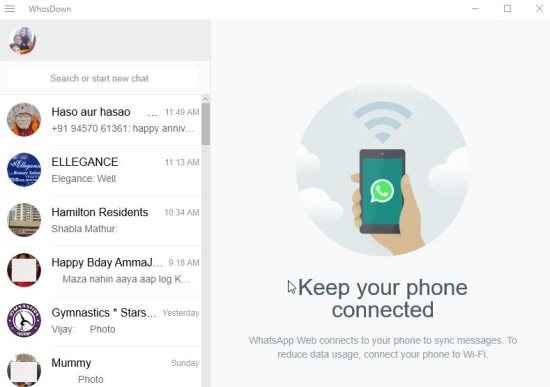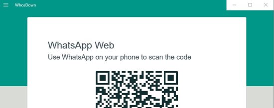 WhosDown is a free unofficial WhatsApp app for Windows 10. What that means is using this app you can use WhatsApp right from your desktop and you do not have to open a web browser. Basically, this app work as a wrapper for WhatsApp web. It lets you run WhatsApp web in a standalone window and you would not require a browser to open it. Running WhatsApp as a standalone window, makes it easy to pin the app to start menu or taskbar. It saves you the hassle of opening the browser again and again to check your messages.