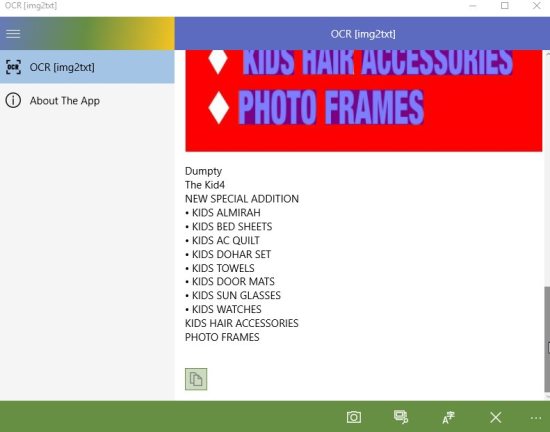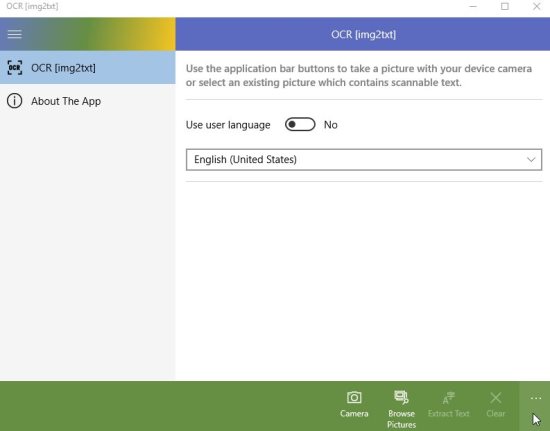 OCR [img2txt] is a free Windows 10 OCR (optical character recognition) app to extract text from any image. The app is pretty simple, all you need to do is either click a photo using your camera or upload a image file. After this just click the extract button and the text from the image file would be extracted. Now you can copy this converted text and use it in any other app.