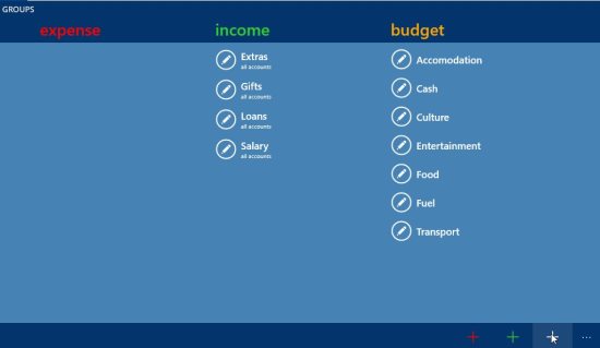 Start with choosing a date for your expense, then select which account you want to add this expense to, then enter the amount spent, select a group for your expense, and then go ahead and save this entry. Couple of expenses are present in the group field drop down menu by default. But if you want to add more you can do that too. On the home screen there is a tile for groups click this tile and a screen like the one shown in the screenshot below will open up in front of you.