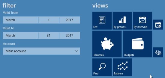 The views tile on the home page lets you filter you data in various ways. You can filter your data by groups, by intervals, view all income, view budget, etc. The view screen is shown below.