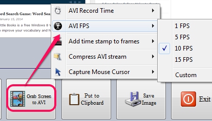 Grab Screen To AVI: This option is used to start video recording of desktop screen and save it as avi format. You need to click on this option to start the recording. But before starting the recording, it is good to adjust settings. Settings such as adjust FPS, record time, enable/disable time stamps option etc. For this, right-click on Grab Screen to AVI option and change settings.