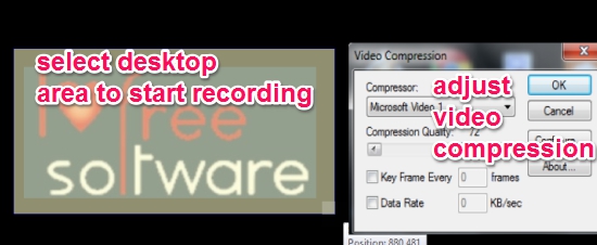 After this you can start recording by selecting an area on desktop. Press and hold Shift key and move mouse cursor using left mouse click to select the area. After this, you need to set video compressor rate (to set compression quality, data rate, etc.), or can leave it default.