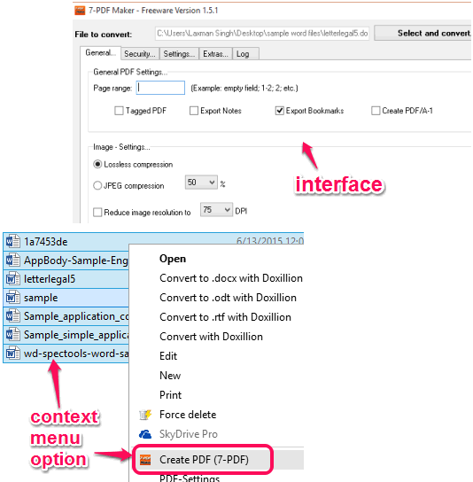7-PDF Maker is a great utility to bulk convert Word to PDF. It provides its context menu option to bulk convert DOC and DOCX files to PDF. Apart from this, you can also use it as a command line tool to convert multiple Word files to PDF files. You need to create a batch file of your Word documents to convert using Command Prompt window.