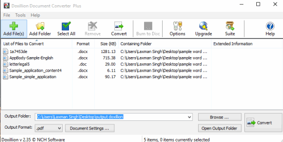 Doxillion Document Converter is also handy to batch convert DOC files in PDF files. Although it can convert DOCX files too, but it failed to convert those files for me. Up to 5 files at a time can be converted using this free basic version.