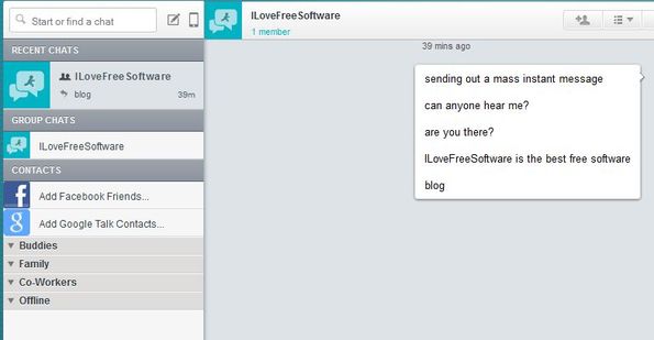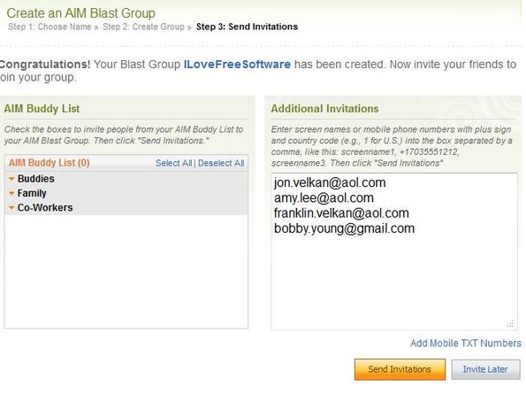 Setup is very simple, you get a three step wizard where you need to type in a group name, change settings, who can join and how (for example) and in the third and last step you need to invite contacts, see first image from the top. After that, login to AIM Instant Messenger, the web based one or the desktop version of it. You should see created group somewhere, click on it, type your message and hit Enter. It will be sent out to everyone in the group.