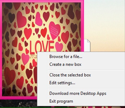 You can open another box by clicking on create a new box. Likewise you can open as many boxes you want in your desktop. Then in order to set a picture you have to click on Browse for a file. Then you can choose the picture you want to set from the drive. It will automatically adjust itself in the box. Clicking on the edit settings option, a pop up window will open up which would let you edit the frame colour, and contrast the frame with the picture and will also allow you to set the level of transparency of the picture.