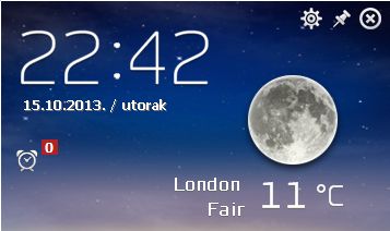 How this free weather gadget looks like can be seen on the image down below. In the top left corner there’s a time and date section where you can view what the current time and date are. Down below there’s an alarm clock icon and above that a 0 which tells you that there’s no new reminders that are scheduled to go off.
