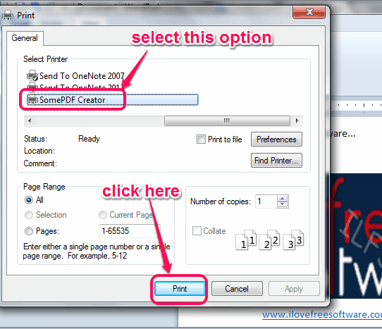 It is handy to use as you don’t need to install and run any PDF creator software separately. Using any text editor’s print option, you can create PDF files. In screenshot below, you could see SomePDF Creator option in Print window of MS Word. The same option will be visible to you also, after installing this software.