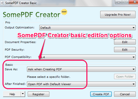 Step 5: This step will open SomePDF Creator Basic window. Here, you can set save as option. That means, you want to save the PDF (that is going to create) on a particular folder or you want to ask for the location during the creation of PDF file.