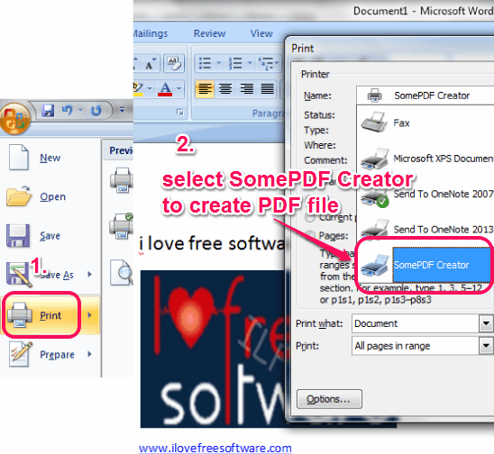 SomePDF Creator is a handy software that helps to create PDF files using print option of Notepad, MS Word, and WordPad. Infact it is able to create PDF files from any application that supports print option. It will actually install as a virtual printer on your PC. After this, on Print window, you will find SomePDF Creator option. Instead of printing your document, it lets you create PDF file from that option.