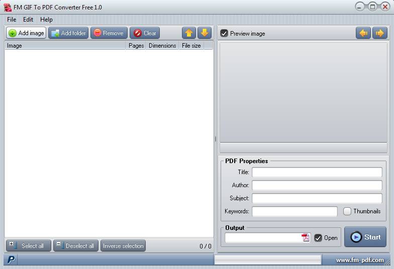 In the image above, you can see the default interface that waits for you when you first start FM GIF to PDF Converter. On the left you can see a large empty area where you can list all the files that you want converted while on the right part of the window you’re gonna see image preview of the files that you want converted, and down below you can even enter PDF metadata. Layout of the interface is very intuitive and everything important for conversion is easily accessible.