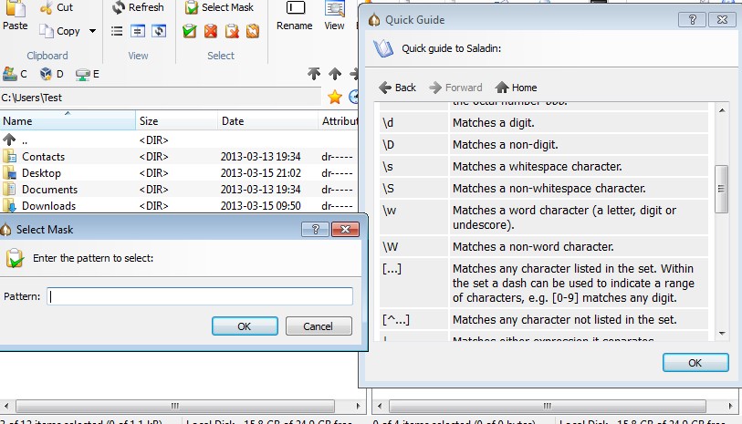 We’re gonna talk about the most interesting features available in Saladin, regular expressions, which can be seen on the image above. File selection using regular expressions can be very helpful when you want to manipulate only with certain files and there’s a regular expression which you can use to select those files easily. There’s a helpful explanation on regular expressions available.