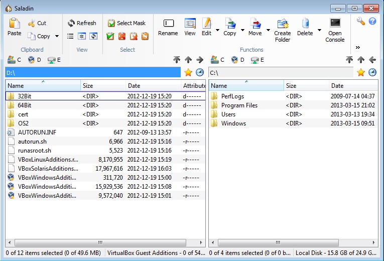 Main menu at the top bears a very similar design to the one that you get in Office 2007, the so called ribbon interface, or should we say toolbar. Various different options for manipulating files are grouped. First you get Clipboard tools followed by View settings, where you can change for example if you want to view hidden files. Third in the line is Select, where you can adjust file and folder selection, Functions for manipulating files, and Tools where additional tools like FTP client and file comparison are available. Key features of Saladin – free dual pane file manager: