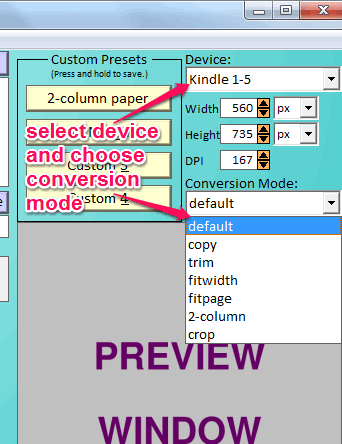 Step 2: Using this step, you will be able to select the output device for which you want to optimize your PDF files. It supports Kindle 1-5, Kobo Touch, Kindle Paper White, Kobo Mini, Kindle DX, Nook Simple Touch, etc. devices. If your device is not listed, then not to worry at all, as you can manually set PDF height & width (in cm, px, etc.), and set DPI value.