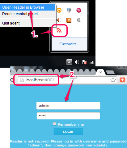 To use this software, you need to right-click on its tray icon, and click on Open Reader in Browser option. It will open a login page in your default web browser, like visible in screenshot below. Now you have to login with default username and password, which is ‘admin’.