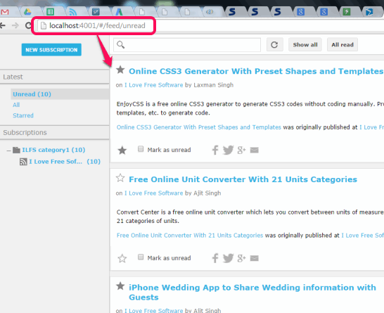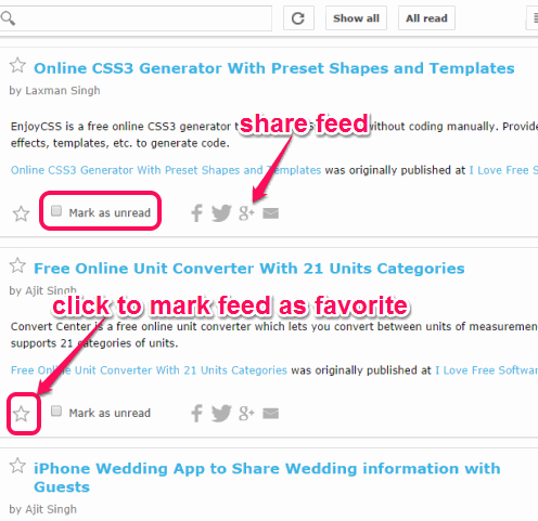 As soon as the URL is added, it will show you latest feeds on its interface. With each feed, option to mark it as read, add to favorites, and share feed to Twitter, Facebook, and Google+ is available.
