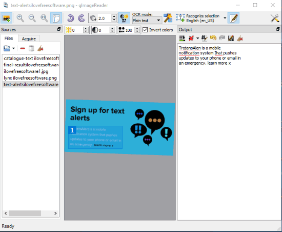 gImageReader is also a nice option to extract text from images. It comes with a unique feature to add multiple images (JPG, PNG, BMP, PBM, XBM, TIF, TGA, CUR, WEBP, etc.), including PDF files, on its interface and then you can extract text from those images one by one. This software provides the feature to automatically select text areas or manually select text area. During my testing, I found that it generates better results when you select text area manually. Also, it didn’t give expected results for the same images that I used in above-mentioned software. There are a few settings that you can adjust like invert image color, rotate the image, set brightness, resolution, etc., but still, the output was not as good. So, I would say in comparison to other software, it wasn’t good enough, but for many images, the output was satisfactory.