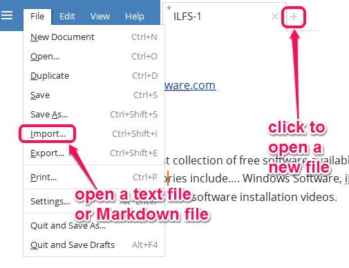 On its interface, you can tap on ‘+‘ button to open a new tab, just like any web browser. After this, you can use File menu to import a file from PC to the active tab. Now you can start editing your file and use features available with this text editor.