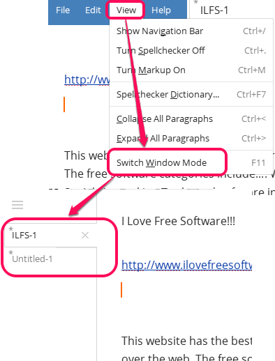 Apart from these features, some basic options are also available that you can access from its menu bar. For example, File menu is useful to export the file as PDF, Markdown, plain text, ODF (Open Document Format) file, etc. Its View menu also comes with multiple useful options, like show/hide navigation bar, open its Spellchecker Dictionary, switch the view mode to Compact and Window mode.