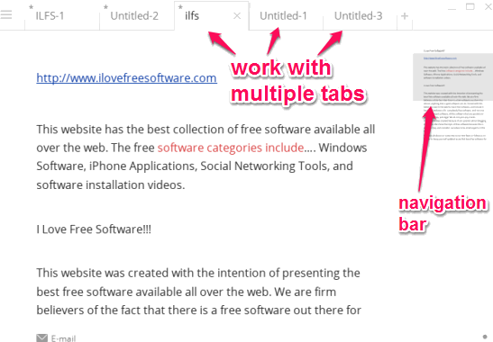 In the screenshot above, interface of this text editor is visible with multiple tabs. On the right side, a navigation bar is also available. This is helpful to easily view the content and jump to a particular part of a long file.