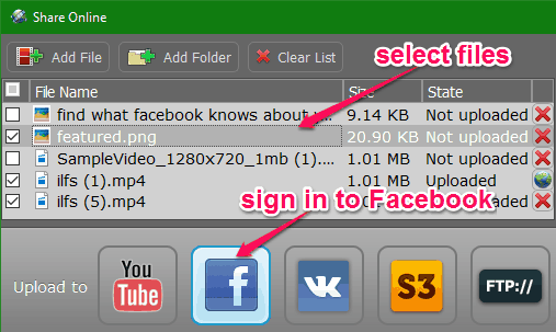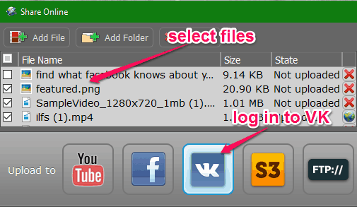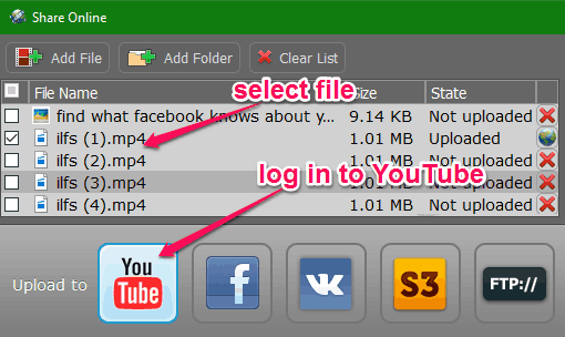 After importing files to this video uploaded, you can either select a single file or multiple files to share at once from the list. The process of uploading videos to Facebook, YouTube, VK, Amazon S3, and FTP is quite similar, except few additional parameters which you get while uploading a file to Facebook, VK, YouTube, and Amazon S3. So, to make it easier for you to use this video uploader, let me explain how to quickly upload videos to all these supported services separately.