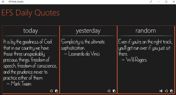 EFS Daily Quotes is a simple app with a neat interface, which can be seen in the screenshot above. The app displays 3 quotes at a time which are for today, yesterday, and random. Each quote has two options given at the bottom. Which are share the quote with your friends, and copy the quote text to your clipboard. You can copy the quote text and then paste it in any application where you would like to use it.