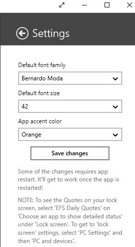 The settings option of the app lets you change the font in which the quotes are displayed, the font size, and the app accent color. Each of these options has a drop down menu from where you can choose a different option. Click the save changes button once you have made the changes. The note at the bottom of this window tells you how to set the displayed inspirational quotes as your computer’s lock screen.