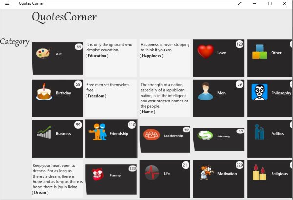 Quotes Corner is a nice app with some good motivational quotes. When you launch this app, you will see a screen displaying quote of the day. This quote of the day can be copied and shared easily by the options given at the bottom of the page. When you scroll towards the right side of the app, you will see a categories screen like the one shown in the screenshot above. Here the quotes have been divided into various categories like wisdom, birthday, business, funny, motivation, religion, philosophy, life, friendship, love, art, etc. You can visit any category and see the quotes inside it.