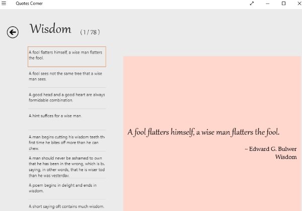 Like the quotes seen in the screenshot above are from the wisdom category. All the quotes in this category are displayed on the left side of the screen. The first quote in this list is shown highlighted on the right side of the screen. You can see any quote on the right side screen by just clicking on it.