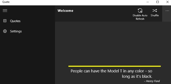Quote is a simple app with motivational quotes about different areas of life. When you start the app you will be greeted with a screen like the one shown in the screenshot above. You will have a quote displayed on the right side of the app window. This quote will auto refresh and change after a few seconds. The category which this quote belongs to will also be displayed at the bottom of the app window. On the left side of the app you will see a menu with two options quotes and settings. Clicking the quotes tab will show you a list of all the quotes to you. Whereas, settings option will bring up a settings window like the one shown in the screenshot below.