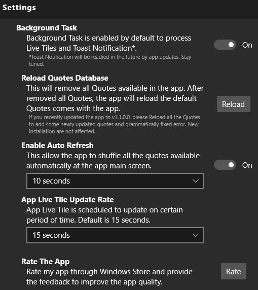 In this window you can change a few things like enable or disable the auto refresh option. If you enable it, you can also select a time period after which the quote would be changed. Background tasks can be enabled or disabled. App live tile update rate time can be chosen from a drop down menu.