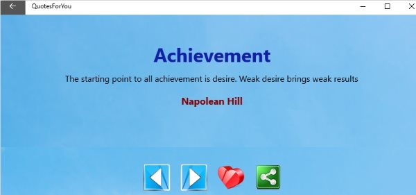 When you select a category a quote will be displayed on screen as shown in the screenshot above. Below the quote you will have the option to move forward or backward to see the previous or next quote. You can also click the heart icon to mark the quote as your favorite. All the quotes you mark as favorite can be seen from the favorites button on the home page. You also have a share option to share this quote with your friends.