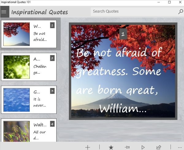 Inspirational Quotes is a nice app with a interface like the one shown in the screenshot above. All the inspirational quotes are listed on the left side of the app window with a different picture in each of them. The bottom part of the app shows you some options. The play option will start reading the current quote out loud. You can also share quotes, mark quotes as your favorite, and pin a quote to the start menu. Apart from this you can also create a new quote in the app. In case you want to add a quote of your own, then click the plus icon given at the bottom. This will open a screen asking for a background photo, then enter the text to display, and go ahead to save the quote in the app.