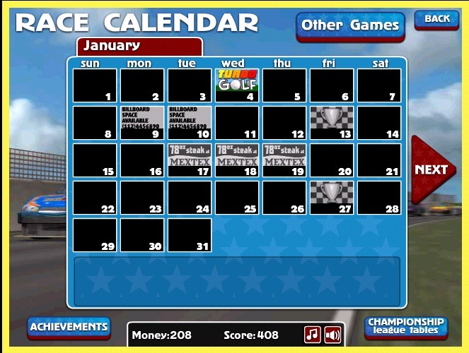 As you use the ‘Play Game’ option, the Race Calendar will be shown to you. From here, select from the enabled races to start racing.