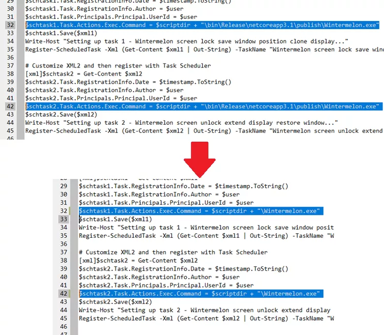 3. Now, with any code/text editor, you need to edit the install_wintermelon.ps1 file. In the line 32 as well 42, you have to make some changes. Edit the path in the double quotes from “\bin\Release\netcoreapp3.1\publish\Wintermelon.exe” to just “/Wintermelon.exe”. You can see this in the screenshot below.