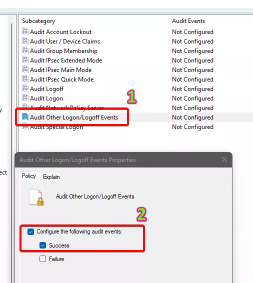 - Double click Audit Other Logon/Logoff Events and then check “Configure the following events” and then check “Success“.